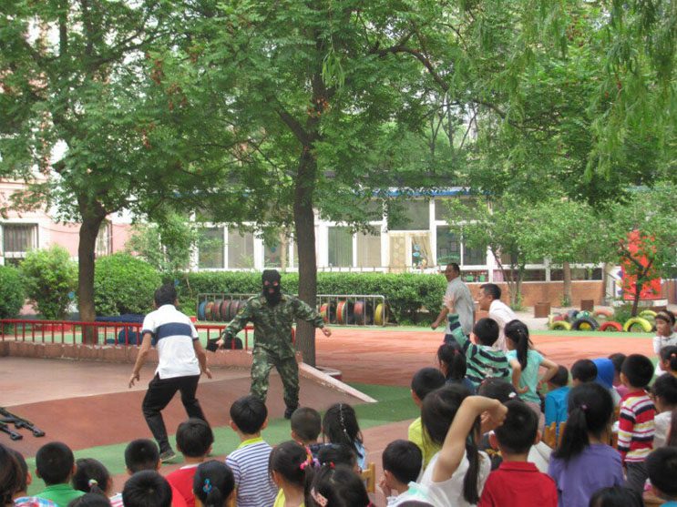 此次培训在全体幼儿和教师中展开,“巨峰特训”团队教员假设“歹徒”以持刀抢劫者进入幼儿园,“巨峰特训”团队其他教员临危不乱采取有针对性防暴力事件的各种措施,最后“歹徒”在大家的齐心协力下被成功制服。