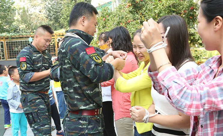 为了提高幼儿园师幼应对突发事件的能力,进一步强化全园师幼的应急意识,维护校园正常的教育教学秩序,保证师幼的生命财产安全,2015年9月15日清友实验幼儿园特邀巨峰特训团队,举行了防恐安全知识培训。