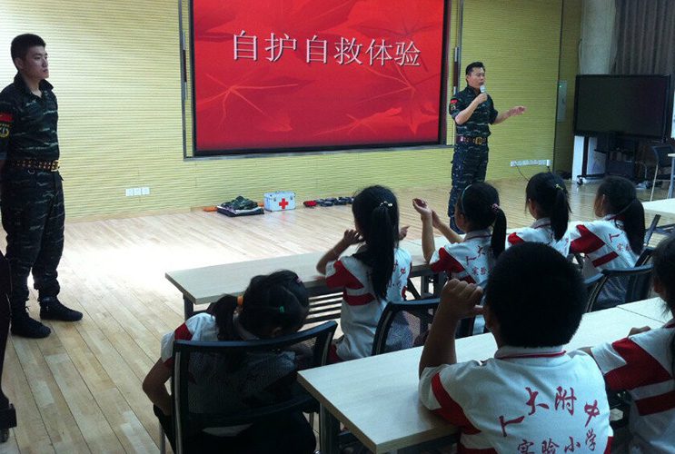 2015年5月21日,人大附中实验小学举办“安全自护体验活动”,被誉为中国青少年防恐教育第一人的马建峰教官,带领巨峰教育的资深防恐教育团队,与孩子们在互动体验中感受防恐安全意识的重要,让孩子们掌握各项自救技能。