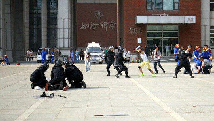 演练“逼真”地再现了暴恐分子潜入学校,在人民大学明德法学楼制造爆炸,引发火灾,随后又砍杀人群,于是学校启动应急方案迅速处置,安保人员紧急疏散师生、救助受伤同学并成功制服暴徒,消防队员迅速到校扑灭火情的全过程。