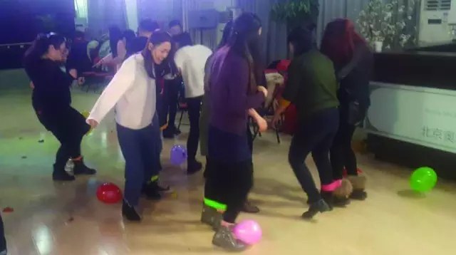 踩气球游戏,淘汰最先被踩光的一组,大家都豁出去了